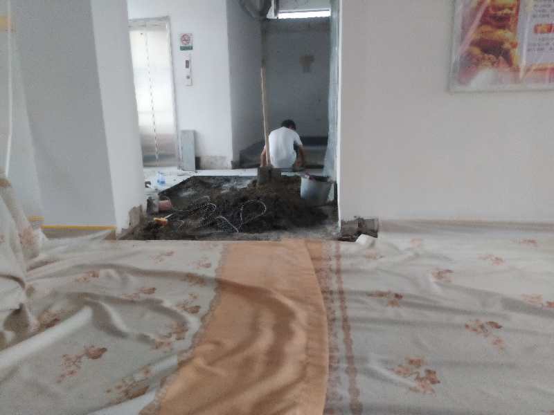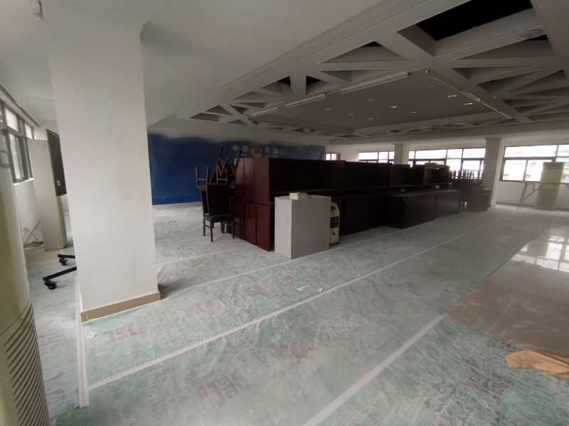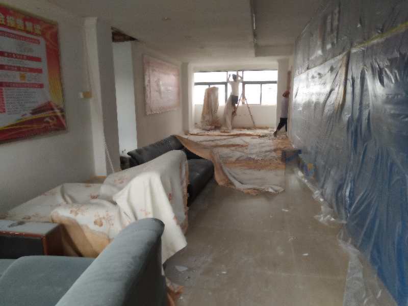 防护措施,使用防尘膜,防止涂料溅射地面瓷砖,布料保护讲台桌子以及其余物品。